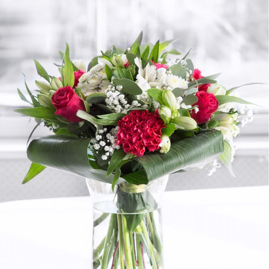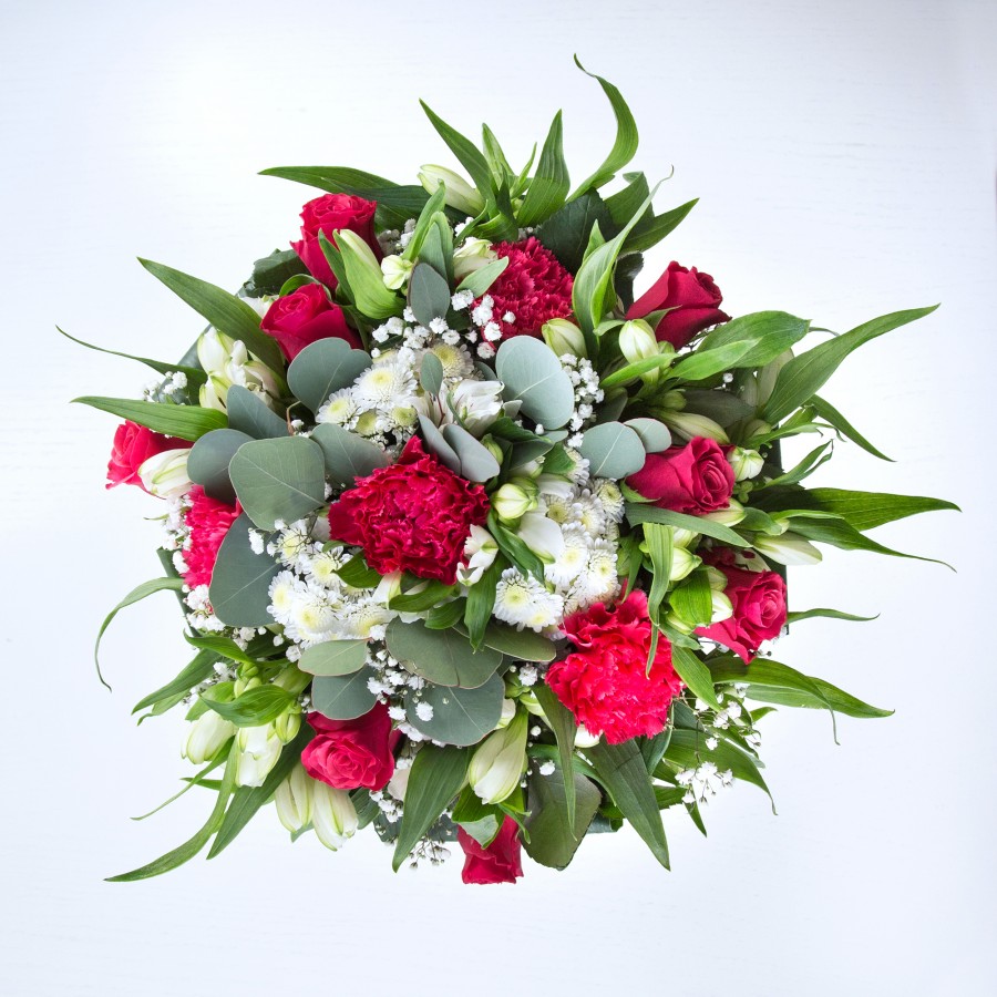 Embrace tranquility with our Serene Beauty Bouquet. This unique arrangement features sweet white chrysanthemums and gypsophila, paired with luxurious red roses and carnations, all delicately arranged with white alstroemeria and aspidistra leaves.